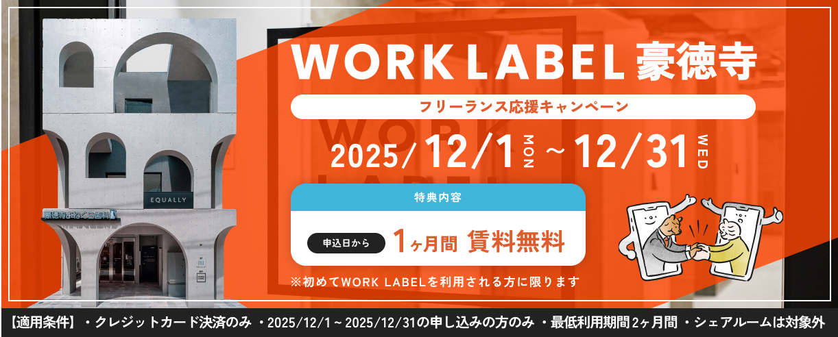 小規模スタートアップにも最適な4人部屋も。 登記無料、会議室無料、高速インターネットNURO光も無料など、無駄なく必要なものだけを提供。最短翌日・短期1ヶ月の利用もできるので、お急ぎの方、手軽に始めたい方にも最適です。新しい働き方をワークレーベルで始めましょう。